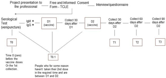 The target population was the team of 134 HCWs at the HU in Cidade Estrutural. The health care team is responsible for providing primary care services for the population of Cidade Estrutural, including vaccinations, examinations, outpatient clinical care, and scheduled appointments, among other services. All HCWs were invited to participate. The study included HCWs who worked in the HU during the period studied that voluntarily signed the informed consent, agreed to provide biological samples (nasopharyngeal swab specimen and peripheral blood), and answered a standardized questionnaire during the investigation. Participants were classified into three categorical groups: HCWs who (i) had not yet received the first dose of the COVID-19 vaccine (Coronavac or AstraZeneca) for any reason; (ii) had received the first dose of any COVID-19 vaccine; or (iii) had received two doses of any COVID-19 vaccine (during this initial period of the study, only Coronavac or AstraZeneca was available to HCWs [13]). In all three cases, the biological material and primary data were collected immediately preceding the scheduled vaccination date. Participants were interviewed to obtain sociodemographic characteristics and had a venous blood sample collected every 30 ± 2 days from the initial sample collection (Figure 2). Data on adverse effects were recorded, and serological analysis was performed at the same intervals. The follow-up period lasted eight months, during which any workers reporting flu-like symptoms were evaluated for COVID-19 using RT-qPCR at any time.