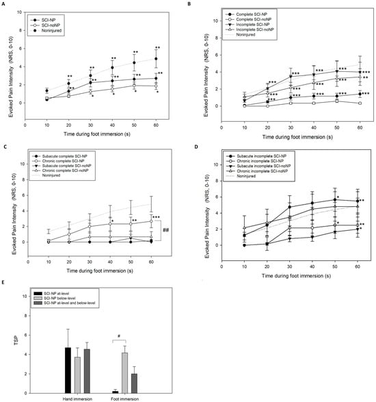 Mean evoked cold pain intensity during foot immersion with the cold pressure test (60 s) in individuals with spinal cord injury (SCI) and healthy participants. (A) Mean evoked cold pain intensity during cold water immersion (12 °C) in individuals with SCI with or without neuropathic pain (SCI-NP or SCI-noNP, respectively) and noninjured (healthy controls); (B) mean evoked cold pain intensity during cold water immersion (12 °C) in individuals with complete or incomplete SCI and presence or absence of neuropathic pain (SCI-NP or SCI-noNP, respectively); (C) mean evoked cold pain intensity during cold water immersion (12 °C) in individuals with complete SCI and presence or absence of neuropathic pain (SCI-NP or SCI-noNP, respectively) in subacute or chronic period of SCI; (D) mean evoked cold pain intensity during cold water immersion (12 °C) in individuals with incomplete SCI and presence or absence of neuropathic pain (SCI-NP or SCI-noNP, respectively) in subacute or chronic period of SCI; (E) temporal summation of cold pain (TSP) intensity associated with foot and hand immersion with the cold pressor test (12 °C) in SCI with at-level, below-level, and both at-level and below-level neuropathic pain (NP). NRS: numerical rating scale. * p < 0.05; ** p < 0.01; *** p < 0.001 (intragroup comparisons). # p < 0.05; ## p < 0.01 (intergroup comparisons). Data are shown as mean and SE (standard error).