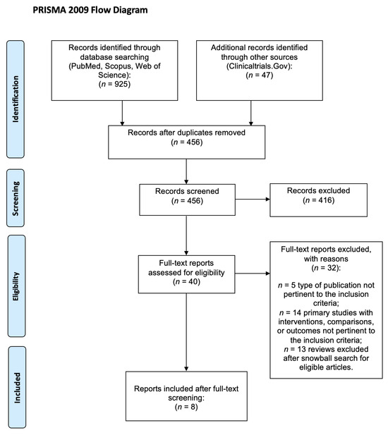 The initial search identified 972 reports; 456 were removed because they were duplicates, and 416 were excluded during the title/abstract screening stage. The remaining 40 articles were assessed for eligibility by reading the full text, and a total of 8 articles were included [24,25,26,27,28,29,30,31] (Figure 1, Table 1). Three articles reported different analyses of the same database [26,30,31], for a total of six studies (one RCT [25], four cohort studies [26,27,28,29,30,31], and one nested case–control analysis [24]), including a total of 34,478 subjects. The studies were carried out in Italy [24], Egypt [25], South Korea [26,30,31], Israel [27], Mexico [28], and multiple European countries [29], and evaluated various COVID-19 clinical outcomes: mortality, hospitalization, need for respiratory support, admission to the intensive care unit (ICU), and cardiovascular or renal complications. Considering the funding, three articles did not report any external funding [25,27,28], five were supported by national health or institutional agencies [24,26,29,30,31], and none received funding by private industry sponsors.