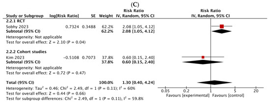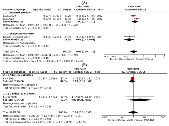 Five reports, representing a total of three studies, compared the frequency of COVID-19 clinical outcomes among paracetamol versus NSAIDs users (Table 1) [25,26,27,30,31]. In the only included RCT, Sobhy et al. [25] compared paracetamol (500 mg/6 h) and ibuprofen (400 mg/6 h) in 180 hospitalized patients with moderate COVID-19. Paracetamol use was associated with a significantly higher risk of ICU transfer compared to ibuprofen (RR: 2.08; 95% CI: 1.05–4.17). Kim et al. [26], in a retrospective cohort of 338 outpatients, observed no significant difference in mortality (RR: 1.71; 95% CI: 0.69–4.24), risk of mechanical ventilation (RR: 1.14; 95% CI 0.42–3.08), and risk of ICU transfer (RR: 0.60; 95% CI: 0.15–2.47) between patients using paracetamol and those using NSAIDs. Accordingly, Park et al. [30] found no significant difference in all-cause mortality (HR: 0.75; 95% CI: 0.35–1.59) and risk of mechanical ventilation (HR: 0.63; 95% CI: 0.19–1.89) between paracetamol and NSAIDs users. Jeong et al. [31], in a retrospective cohort of 967 hospitalized patients, found no significant difference between paracetamol and NSAIDs users in the occurrence of cardiovascular complications (OR: 1.15; 95% CI: 0.69–1.92) or secondary acute renal failure (OR: 1.92; 95% CI: 0.27–14.29). Rinott et al. [27] reported a non-significant increase in mortality (unadjusted RR: 4.07; 95% CI, 0.21–77.19) and the risk of respiratory support (unadjusted RR: 6.34; 95% CI: 0.84–47.64) among exclusive paracetamol users compared to exclusive ibuprofen users. Based upon the data available, two meta-analyses could be performed: the first evaluating the risk of death (Figure 2B), and the second assessing the likelihood of being transferred to the ICU (Figure 2C). Both meta-analyses included two studies, and found no statistically significant differences between paracetamol and NSAIDs (respectively, RR: 0.93; 95% CI: 0.31–2.80, and RR: 1.30; 95% CI: 0.40–4.24). The results of the subgroup analyses did not show a significant difference by level of adjustment (Figure 2B; p = 0.28) or study design (Figure 2C; p = 0.11). The sensitivity analysis substituting the results from Park et al. [30] with those from Kim et al. [26]—which were obtained by analyzing the same database with different models—also showed no statistically significant results for the mortality outcome (Figure S1).