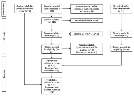 After removing duplicates, 519 references remained of the 572 originally yielded from the electronic database search. Phase 1 involved evaluating the titles and abstracts of the selected studies and taking into consideration 12 papers that could be read in full. After adding two more articles from other umbrella reviews and four articles for various reasons, only eighteen SRs remained for quality synthesis. Table 2 provides the rationale behind exclusion for each relevant article [17,18,19,20,21,22,23]. Figure 1 depicts the entire procedure for identification and selection for the research.