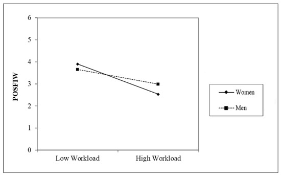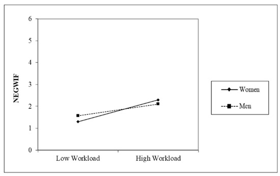 H4 has been partially confirmed. Gender moderated the relationship between workload and three work–family interface dimensions (NEGWIF, POSWIF and POSFIW) in the indirect relationship between workload and interpersonal strain, as confirmed by previous studies [14,15,16]. Under conditions of high workload, women suffer more negative interference from work to family (in terms of greater conflict and less enrichment), and from family to work in terms of less enrichment. Gender, however, has not moderated the relationship between workload and NEGFIW. In general, both men and women are discouraged from bringing their family problems to work.