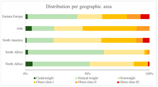 Weight distribution of cohort, stratified by geographic area of origin and based on BMI values.