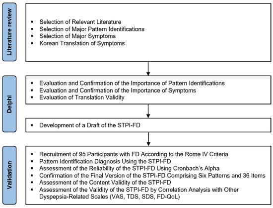 Pattern identification (or syndrome differentiation) is a unique clinical diagnostic process commonly used in traditional complementary or alternative medical systems in Asian countries. This process involves comprehensively collecting, analyzing, and subdividing the complete information of a patient gathered through inspection, listening, smell, inquiry, and palpation to determine the location, cause, and nature of the disease. This information can subsequently be used to prescribe herbal medicines and to evaluate treatment effectiveness and prognosis []. However, in the absence of specific guidelines for pattern identification of each symptom or disease, pattern identification tends to rely on the subjective opinions and experiences of individual practitioners. This can lead to issues with reproducibility, reliability, and objectivity. Consequently, there has been a recent surge in the development of questionnaires and diagnostic tools aimed at standardizing pattern identification. Questionnaires based on traditional Korean medicine (TKM) diagnoses, such as the cold–heat pattern [], deficiency–excess pattern [], blood stasis pattern [], and phlegm-retained fluid pattern [], have also been developed. Pattern-identification tools for dyspepsia have specifically been developed to differentiate food retention disorder (FRDO) [], spleen qi deficiency pattern [], and stomach qi deficiency pattern []. One study on the frequency of pattern identification among 97 Korean patients with FD used a pattern identification instrument based on the Chinese clinical guidelines for FD []. The distributions of the five identified patterns were as follows: spleen deficiency and phlegm dampness; liver depression and spleen deficiency; liver depression and qi stagnation; tangled cold and heat (TACH); and food accumulation []. In 2010, a pattern-identification tool for FD was developed in Korea. This tool comprises 45 items, 12 of which are related to tongue and pulse diagnoses, and categorizes FD symptoms into six types: liver–stomach disharmony (LSDH); dampness and heat in the spleen and stomach (DHSS); spleen and stomach deficiency and cold (SSDC); TACH; food retention disorder; and insufficiency of stomach yin []. However, because the symptom items and indicators for pattern identification were extracted solely from classical textbooks, their reliability and validity have not yet been tested in patients. Furthermore, opinions regarding the clinical application of certain patterns differ and modifications and improvements are required before practical clinical applications can be implemented.