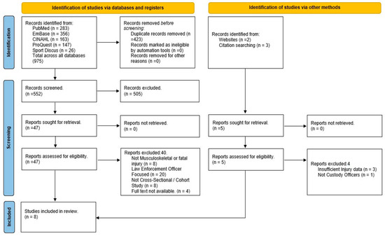 The results of the identification and screening process were represented in a PRISMA flow diagram (Figure 1). The initial search identified 975 records, along with five documents that were identified via other methods and did not appear among the search strategy (two via websites and three via citation searching). The removal of 423 duplicate records left 552 records to be reviewed by title and abstract to identify records clearly not relevant to the study (e.g., dealing with individuals who have mental illnesses: the Crisis Intervention Team (CIT) in law enforcement [29]). The resulting 52 records were reviewed in detail and considered against the inclusion and exclusion criteria. Following this process, eight studies were left to inform the review, with the remaining studies and their reasons for exclusion presented in Figure 1.