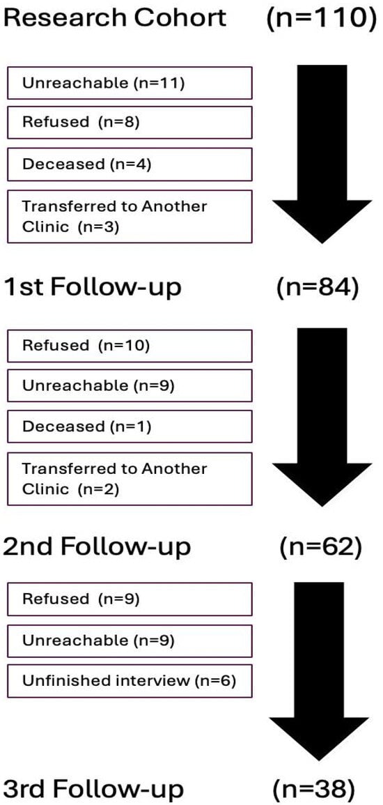 To minimise potential dropouts, conducting follow-ups at shorter intervals (e.g., once a month) rather than every two months in multi-centre studies may help maintain participants’ engagement and reduce dropout rates. Additionally, sending reminder messages to cohort participants before each follow-up can boost motivation and encourage continued participation in the study.