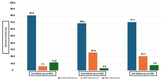 Additionally, an increase in the 90% adherence rate was observed in the second and third follow-ups, indicating that some patients maintained adherence with irregular medication intake. In another study conducted on TBD in Turkey, similar to ours, where adherence was measured using a more sensitive and cross-sectional study design, similar adherence levels were observed [20]. This finding is consistent with other studies showing a decrease in adherence when patients enter the continuation phase [11,12].