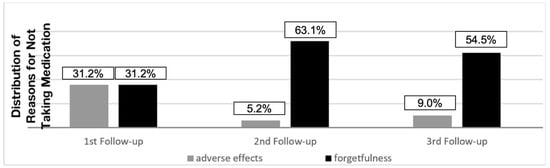 As the follow-up period progressed, it was observed that the number of patients above 90% adherence increased, but there was a decrease in the frequency of those with full adherence. Other studies also classify and evaluate adherence in this manner [31,32]. Drug side effects that cause a decrease in patient adherence are generally observed in the first three months of treatment [33,34]. In the present study, drug side effects were the most common reason for not taking medication at the first follow-up (31.2%) (Figure 3). In the follow-ups after switching to maintenance treatment, more than half of the patients who did not take medication stated forgetfulness as the reason.