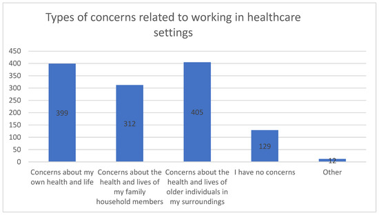 Figure 2 provides a visual representation of the different types of concerns reported by participants. This figure displays the types of health-related concerns reported by healthcare workers during the COVID-19 pandemic. The most common concerns were related to the health and safety of older individuals in their surroundings (405) and their own health and life (399). Many also expressed worries about the well-being of household members (312). A smaller group (129) reported no specific concerns, while a few (22) indicated other types of concerns. These results highlight the breadth of anxieties experienced by healthcare workers, reflecting the multifaceted impact of the pandemic on those in healthcare settings.
