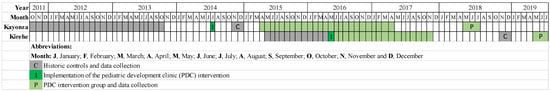The PDC program provides medical, nutrition, and developmental follow-up to children with high risk of poor early childhood outcomes at hospital- and health center-based PDCs. Children are primarily referred to PDC from hospital NCUs at the time of discharge when they meet the conditions for enrollment in PDC. The PDC is operated by an inter-professional team of nurses and social workers with supervision oversight from a general practitioner, who provide care through outpatient clinics that operate one or two days per week. At the beginning of the PDC assignment, providers receive five days of training on components of PDC care and about once-monthly ongoing post-training mentorship by pediatricians and PDC staff. On clinic days, caregivers and children participate in a group education session on topics such as play and communication, health, nutrition, and hygiene, followed by individual nurse consultations to assess vital signs, danger signs, growth, nutritional intake, and child development. During the period covered by this study, child development was assessed using the Ages and Stages Questionnaires-3 (ASQ-3). PDC provides infant formula when medically necessary for infants under 6 months, food support for mothers of breastfeeding children less than 6 months who are growth faltering, and food support for children over 6 months who are growth faltering. Caregivers may also receive additional social support, counseling, and transport reimbursements based on social worker assessment of socioeconomic need. All PDC visits are recorded into an electronic medical record system. Under the current model, which was implemented in August 2017, children are systematically followed at 1, 2, 4, 6, 9, 12, 18, 24, 30, and 36 months of age, with preterm or LBW infants receiving additional weekly visits until they reach 1 month corrected age. Prior research indicated that the majority (63.5%) of PDC patients respect their PDC follow-up schedules, though at the time, follow up was only required until 24 months of age for children with no other health, nutritional, or developmental concerns []. The PDC intervention was initially implemented in Kayonza in April 2014 and later expanded to Kirehe in May 2016. More details about the PDC intervention and its implementation can be reviewed elsewhere [,].