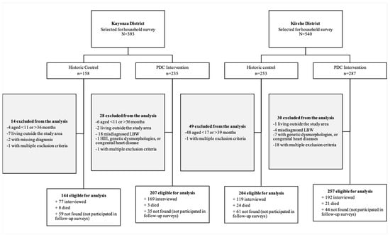 To evaluate the intervention, cross-sectional household surveys were implemented to measure mortality, nutritional, and developmental outcomes before and after the implementation of the PDC intervention in both districts. Participants in the pre-intervention surveys were identified using hospital NCU records and would have been eligible for PDC if the program had existed at the time of their discharge from the hospital NCU. In both Kayonza and Kirehe districts, the surveys targeted children who were discharged alive from the hospital NCU and born preterm or with LBW (i.e., birthweight < 2000 g, as it was the definition of LBW diagnosis for admission in NCU). At the beginning of the PDC implementation in Kayonza, the baseline survey (historical control group) included only preterm or LBW children as this was anticipated to be the primary and largest population served by the new service (PDC). However, by the time of expansion into Kirehe, it was understood that children with birth asphyxia and suspected HIE were a comparably large population served by the clinic, representing about a third of children enrolled in PDC, and were therefore included in Kirehe data collection to assess programmatic impact []. In addition, the surveys targeted children who would be aged between 11–36 months in Rwinkwavu and 11–47 months in Kirehe at the time of data collection. The extended age range in Kirehe was included due to anticipated lower participation in the household survey, particularly among the pre-intervention group, as was previously observed in the Rwinkwavu sample []. The target age group of survey participants was determined based on the timeline of household surveys for both control and intervention groups in each district as well as the need to allow at least one year of exposure to the intervention for the PDC group. Children from the Mahama refugee camp in Kirehe and from outside the Rwinkwavu and Kirehe District Hospitals’ catchment areas were excluded from all phases of the study. Household surveys for historic controls occurred between November–December 2014 in Rwinkwavu and between October–December 2018 for Kirehe (Figure 1). The post-intervention surveys included children who met the study inclusion criteria and were born in the PDC era. Data collection among PDC infants occurred between May–July 2018 in Rwinkwavu and between May–July 2019 in Kirehe.
