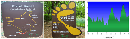 The research was conducted in the Jeongbal Mountain (Jeongbalsan) urban forest. The mountain has an altitude of 87 m. The site is in Ilsandong-gu, Goyang-si, Gyeonggi-do, Korea. This urban park is adjacent to residential areas. It falls within Korea’s central temperate zone (37°39′42″ N, 126°46′42″ E) and covers 644,649 m2. Green areas account for over 91% of the park’s total area, and the main tree species are pine trees, Korean pine trees, and metasequoia. The park is a recreational and exercise space used to promote urban citizens’ health. The walkable distance at Jeongbalsan Dulle-gil is 4.4 km, with an average slope of 7.5°. The trails that run north and west comprise sandy loam, and the trails that run south and east consist of fine red clay. The “rest road” is safe for barefoot walking and was created under the Goyang City “earthing road” project in 2021. Figure 1 provides further information about the site.