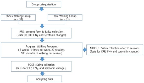 This study aimed to verify whether physiological changes occurred when barefoot walking was performed in an urban forest environment. To this end, adults participated in a walking program, and changes in the levels of the following factors were analyzed: CRP, an indicator of the inflammation level and the possibility of diseases; IFNγ, an NK cell activity indicator; and serotonin, which is known as the happiness hormone.