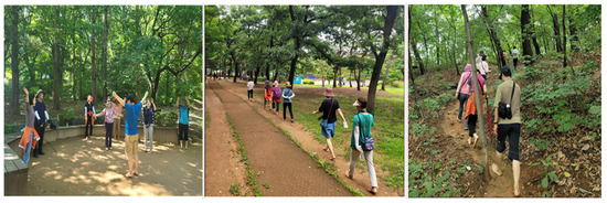 The healing elements of forests include scenery, phytoncide, anions, oxygen, sound, and sunlight. Kim et al. [8] classified forest healing methods as plant, climate, and water therapies, all of which utilize forest resources, as well as diet, exercise, and psychotherapy, which can be practiced in forests. Among these, exercise therapy has three subcategories: experience type, barefoot walking, and forest gymnastics.