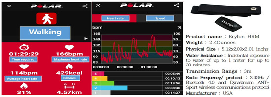 The sneaker-wearing and barefoot groups performed the experiment in the same environment and under identical conditions. The smartphone walking management application Polar Beat was operationalized before the participants started walking. Upon completion of the exercise, the application stored each participant’s actual exercise time, distance, workout intensity, average heart rate, and maximum heart rate. Additionally, a Bryton heart rate monitor was attached to each person’s chest once per week to adjust the workout intensity to ensure that the actual heart rate remained within 50–70% of each individual’s THR. Analyzing the stored exercise intensity data protected the experimental data’s objectivity and reliability. Figure 4 shows the method used to measure walking exercise intensity.
