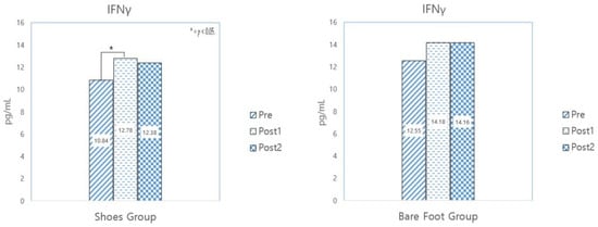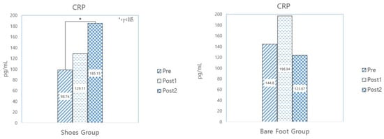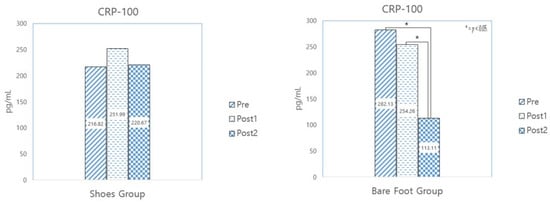 Table 9 shows the results of analyzing CRP changes after selecting, from among all 62 participants, only those who exhibited a saliva CRP inflammation level of 100 pg/mL or higher before the experiment. The targets included 14 people from the barefoot group and 9 from the sneaker-wearing group. A paired sample t-test was conducted to examine the changes.