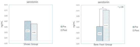 Third, serotonin, a neurotransmitter related to feelings of well-being, is secreted from the hypothalamic–pituitary axis in the brain. Excessive serotonin excites and stimulates brain function, whereas a lack of it causes depression by degrading brain function. Serotonin maintains balance and controls synaptic activity, which regulates body temperature, sensory perception, immune response, motor function, neuroendocrine control, appetite, learning, and memory [51]. Over 95% of serotonin is produced by the enteric nervous system, which is commonly referred to as the “second brain”, and only approximately 3% of serotonin is produced in the brain [52]. When a person is stressed, intestinal microorganisms secrete stress hormones that adversely affect the intestines, which may cause higher stress by inducing negative emotions through the limbic system [53]. Consequently, serotonin, a neurotransmitter that delivers feelings of well-being, decreases under stress, and dopamine is excessively produced, which may lead to aggression, depression, and suicidal impulses [54]. The 0.005–0.045 ng/mL range is considered normal for serotonin despite differences depending on age, sex, and health status. After the experiment, most of the barefoot group reported improved sleep quality, peace of mind owing to communion with nature, and a positive attitude in response to subjective questions about their feelings. The sneaker-wearing group reported improved physical strength, self-confidence, and vitality. These results were expected because barefoot forest walking relaxes the body and mind through contact with the ground, compared to walking in sneakers. Hence, barefoot walking leads to psychological stability through stress and tension relief and heightened physical stimuli and attention. In a previous study, the serotonin concentration increased in middle-aged women who walked and ran for 12 weeks [55]. The results of the barefoot walking experiment conducted in this study suggest that stimulating the soles of the feet, a sense of unity with nature, and the satisfaction derived from walking in a forest environment positively affected serotonin.
