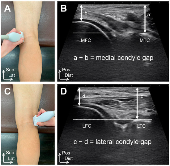 Tibiofemoral joint alignment was based on ultrasound imaging examinations in Study 1. The distance between the posterior margins of the femoral and tibial medial condyles was deemed the medial condyle gap, and the distance between the posterior margins of the femoral and tibial lateral condyles was measured as the lateral condyle gap (Figure 1). The ML gap was calculated by subtracting the lateral condyle gap from the medial condyle gap.