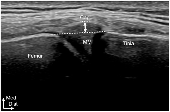 MME measurements. MME (white arrow) was measured as the vertical distance from the line segment connecting the medial end of the medial condyle of both the femur and tibia (white line), excluding the osteophytes, to the outer edge of the medial meniscus. MM, medial meniscus; Cap, joint capsule; Med, medial; Dist; distal.