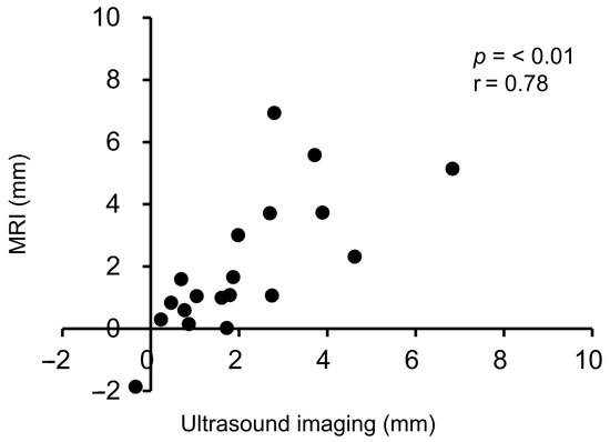 The ML gap of the ultrasound imaging was found to be significantly and highly correlated with the ML gap of the MRI (Figure 4; r = 0.78, p < 0.01).
