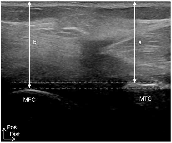 Knee OA with posterior shifted. A long-axis image was obtained to visualize the most prominent posterior points of the medial femoral condyle and the most prominent posterior point of the medial tibial condyles. a = 23.2 mm. b = 24.9 mm. Medial condyle gap (a − b) = −1.7 mm. MTC, medial tibial condyle; LFC, lateral femoral condyle; Pos, posterior; Dist, distal.