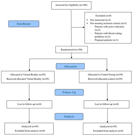A total of 198 patients were initially recruited for the study. However, 5 patients were withdrawn before randomization for not meeting the inclusion criteria, and 3 others declined to participate in the intervention, resulting in a final sample size of 190 participants. These 190 patients were randomly assigned to two groups, the IVR group (n = 95) and the control group (n = 95), with the latter not using an IVR device (Figure 1).