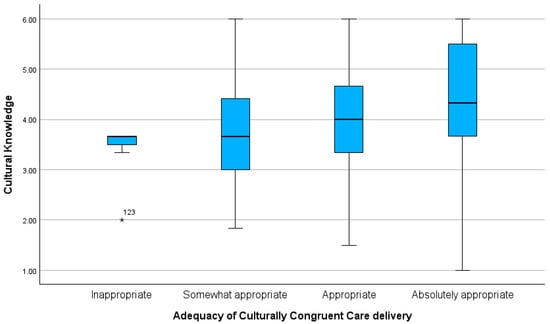 Significant differences were found in the mean scores of Cultural Knowledge (H(3) = 8.817; p = 0.032) between nurses with different levels of culturally congruent care delivery. Multiple comparison analysis revealed that those differences occurred between nurses who rated their care as “Inappropriate” and “Absolutely Appropriate” (p = 0.018), as well as between “Somewhat Appropriate” and “Absolutely Appropriate” (p = 0.014). As observed in Figure 1, the score of Cultural Knowledge was lower among nurses who considered their care “Inappropriate” (M = 3.42; SD = 0.58) and higher among those who considered their care “Absolutely Appropriate” (M = 4.38; SD = 1.03).