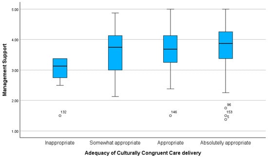 Comparison of Management Support scores across nurses’ perceptions of the adequacy of culturally congruent care delivery.