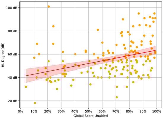The relationship between GS unaided and the HL degree can be visualized in Figure 1.