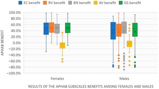 Comparison of APHAB subscale benefits by gender. Legend: EC—ease of communication, RV—reverberation, BN—background noise, AV—aversiveness, GS—global score.