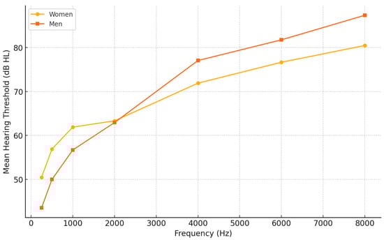 The analysis revealed that in the group with severe HL, men had greater degree of hearing loss at high frequencies than women (p < 0.05). The audiograms are presented in Figure 3.