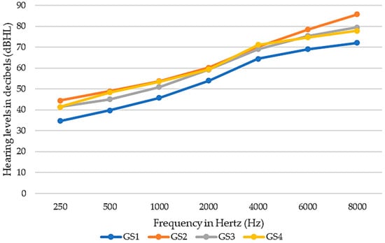 Additionally, we divided patients into four equal groups according to increasing GS benefit. One-way ANOVA and post-hoc analysis revealed that the GS1 group (group with the lowest benefit from HA) was significantly younger and had a significantly lesser degree of HL than the other GS benefit groups (Table 7). Such a correlation was not noticed in the other groups (GS 2–4) (Table 7). The other groups, irrespective of GS in the APHAB questionnaire, had similar PTA results (Figure 4). Moreover, the Pearson correlation was performed and it was revealed that the benefit of GS had an insignificant correlation with the average age of the patient (r = 0.02; p-value = 0.77).
