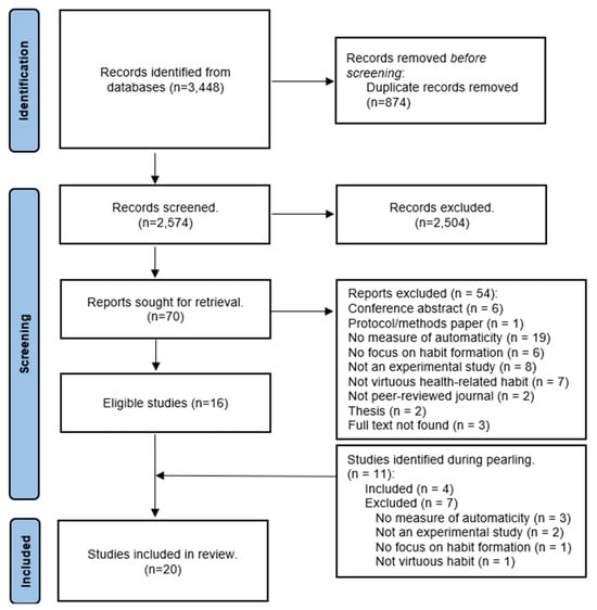 A total of 3448 records were identified following a database search. After removing the duplicates, 2574 records remained and were screened based on their title and abstract. From this screening, 70 records were selected for a full-text review. After full-text screening, 16 studies met the eligibility criteria. Pearling (backward and forward citation tracking) of these included studies yielded an additional 11 studies, 4 of which were eligible. Therefore, a total of 20 studies were included in the final analysis (see Figure 1 for the reasons for exclusion). A list of excluded studies with reasons for exclusion is included in Table S2. The risk of bias, based on the PEDro scale, is shown in Table 1. Most studies had a high risk of bias rating (i.e., low quality, n = 11), while five had a low risk of bias rating (i.e., high quality).