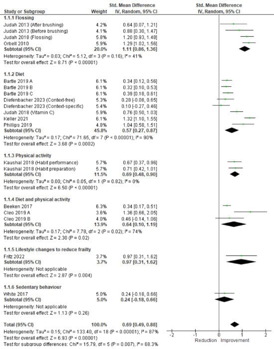 A meta-analysis was performed to assess the change in habit effect size between pre- and post-intervention for studies assessing the SRHI or SRBAI. Behaviours in these studies included diet [,,], diet and/or physical activity [,,,], lifestyle changes to reduce frailty [], sedentary behaviour [], flossing [,] and flossing and Vitamin C consumption []. A pooled analysis of 12 studies (19 intervention conditions) showed a significant improvement (moderate-to-large effect size) in habit scores between pre- and post-intervention across the different interventions (SMD = 0.69, 95% CI = 0.49, 0.88; I2 = 87%, p < 0.01, Figure 2). The individual effect sizes for the different behaviours were SMD = 1.11 (95% CI = 0.86, 1.36; large effect size) for flossing, SMD = 0.57 (95% CI = 0.27, 0.87; moderate effect size) for diet, SMD = 0.69 (95% CI = 0.48, 0.90) for physical activity, SMD = 0.64 (95% CI = 0.10, 1.19; large effect size) for diet and physical activity, and SMD = 0.97 (SMD = 0.31, 1.62 large effect size) for lifestyle changes to reduce frailty. There were no significant effects for sedentary behaviour (SMD = 0.24, 95% CI = −0.18, 0.66).
