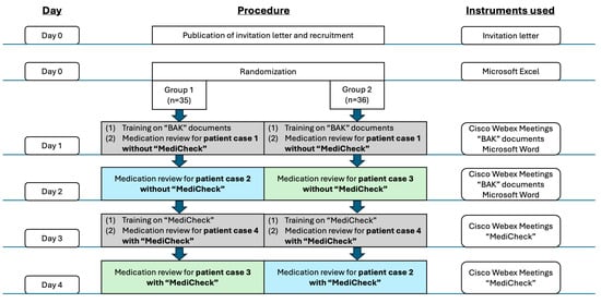 The “Medi-fASt”study (“Medikationsanalysen für Apotheken—Softwareunterstützt und therapieoptimiert”) is a randomized, controlled cross-over study. The study was conducted entirely online. Participants were recruited via an invitation letter prepared by employees of the Institute of Clinical Pharmacy and Pharmacotherapy Duesseldorf, Germany. The invitation letter was published in the newsletter and on the social media platform of the company “pharma4u GmbH”, which provided the CDSS “MediCheck” during the study. Notably, “pharma4u GmbH” focuses on the development of digital, web-based software, apps, and content for pharmaceutical professionals and provides its services to more than 10,000 customers [23]. Furthermore, an advertisement for participation in the study was published in a German journal for pharmacists (“Pharmazeutische Zeitung”). In addition to information regarding the study procedure and requirements for participation, the invitation letter included the contact details (e-mail address and telephone number) of the study director (A.D.), in case further information was required or the individuals wished to register for the study. The study itself took place between April and May 2024, with each participant engaged in the study for a period of four days over the course of one week. Interested parties were offered the option of participating in the study for one week in either April or May. The inclusion criteria for participation in the study were as follows: (1) possession of a German license to practice as a pharmacist, (2) current employment in a community pharmacy at the time of the study, (3) no establishment of MR as a standard service in the employed pharmacy, (4) possession of a PC or laptop with “Microsoft Word” 2021 software, and (5) a signed declaration of consent to participate in the study and to data protection. The recruitment period ended one week prior to the respective study week. To protect the participants’ privacy, each participant was assigned a pseudonym for the duration of the study. Prior to the start of the study, the participants were randomly assigned to one of two groups. The study was approved by the Ethics Committee of the Medical Faculty of Heinrich Heine University Duesseldorf (study number: “2024-2739-andere Forschung erstvotierend”) and registered in the German Clinical Trials Register (DRKS00034910). The primary endpoint of this study was the measured time required to perform a MR. The secondary endpoints were the number of predefined DRPs detected and the outcomes of the questionnaire, in which participants were asked to rate statements on the use of CDSS. The complete study procedure and time schedule is illustrated in Figure 1.