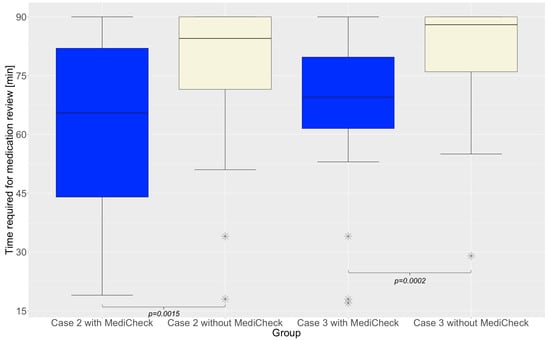 The results of the primary endpoint show that participants without the use of the CDSS took 30.7% more time for the MR of patient case 2 than with the use of a CDSS. For patient case 3, the participants without a CDSS needed 25.7% more time than the participants who completed this case with the CDSS “MediCheck”. The results are presented in Table 3. To check whether the two groups were equally strong and comparable with each other, patient case 1 was completed by both groups under the same conditions, and the results demonstrated that both groups were comparable as they did not differ significantly in time required (p = 0.2026). Regarding patient case 2, “Group 2”, which was permitted to utilize the CDSS “MediCheck”, required significantly less time for processing than “Group 1”, which resolved the case without “MediCheck” (65.5 min vs. 84.5 min; p = 0.0015). However, patient case 3 was reviewed by “Group 1” with “MediCheck” and by “Group 2” without “MediCheck”. Similarly, the case was completed at a significantly faster rate with the use of “MediCheck” (69.5 min vs. 88 min; p = 0.0002), as shown in Figure 2.