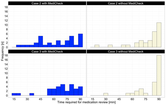 For a more detailed look at the primary endpoint, Figure 3 shows histograms of the distribution of the participants’ time requirements for a MR. For patient case 2, participants without “MediCheck” were required to utilize the maximum specified time of 90 min with considerably greater frequency than the participants with “MediCheck”. With patient case 3, a difference in the distribution between “Group 1” and “Group 2” is also observable. In this case, significantly fewer participants required the maximum time of 90 min to complete the case with “MediCheck” than without “MediCheck”, as shown in Figure 3.