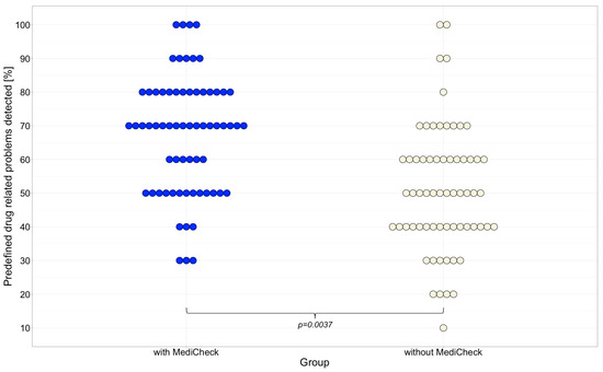 The secondary endpoint was defined as the number of predefined DRPs detected. Significantly more predefined DRP were identified with the use of the CDSS “MediCheck” than without (70% vs. 50%; p = 0.0037). There is no significant difference between “Group 1” (50%) and “Group 2” (50%) in the first patient case in terms of DRPs (p = 0.3615). Both groups are, therefore, also comparable in terms of performance. “Group 2” was demonstrably more effective in detecting predefined DRPs in patient case 2 when using “MediCheck” than “Group 1” without using “MediCheck” (70% vs. 60%; p = 0.0009). In patient case 3, the use of “MediCheck” led to a significant increase in the detection of predefined DRPs (p = 0.0232), with 65% detected with “MediCheck” compared to 40% without, as shown in Figure 4. Table 4 lists the DRP scores obtained for each patient case. Figure 5 also shows that the distribution of the detected predefined DRPs shifts towards 100% when a CDSS is used. This indicates a significant improvement in the quality of the MR.