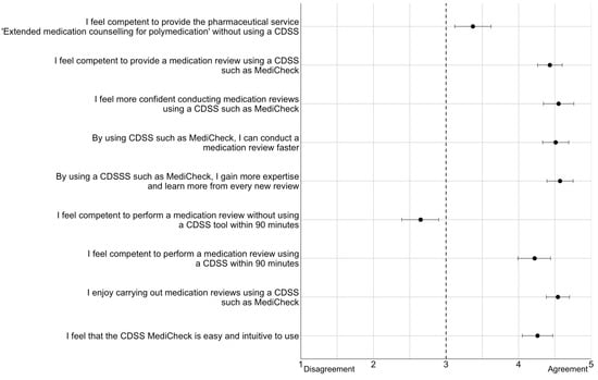 At the end of the last study day, participants were asked to complete a questionnaire. This contained three questions on demographics and nine statements to be rated. The demographic questions were related to age, gender, and work experience in a community pharmacy. The nine statements related to the implementation of a MR with and without the use of a CDSS. They were measured using a five-point Likert scale (1 = “strongly disagree”, 2 = “disagree”, 3 = “neither agree nor disagree”, 4 = “agree”, 5 = “strongly agree”). The statistical analysis of the statements was presented in a forest plot. The nine statements are shown in Table 1.