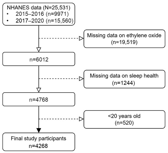 We used data from the NHANES (National Health and Nutrition Examination Survey), which is an ongoing program of studies designed to evaluate the health and nutritional status of adults and children in the United States. A detailed description of the survey protocol has been reported elsewhere [31,32]. In this analysis, we included the data from two cycles of the NHANES through the 2015–2016 and 2017–2020 surveys to analyze the association between EO exposure and sleep health. As shown in Figure 1, after the exclusion of 20,763 participants with insufficient data regarding exposure and outcome and 520 participants who were <20 years old, a total of 4268 participants were included in the current analysis. All procedures were approved by the National Center for Health Statistics (NCHS) Ethics Review Board (https://www.cdc.gov/nchs/nhanes/irba98.htm, accessed on 6 April 2024.), and all participants provided written informed consent.