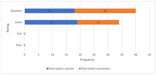At the end of Workshop 3, participants provided their feedback (n = 37 forms). Questions 1 and 2 were related to rating the community event and its content (Figure 2), where most participants rated the event as good and the content as excellent.