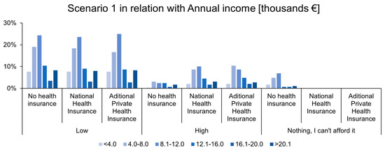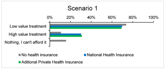 Scenario 1 explored treatment options for a herniated disc, providing participants with a choice between less expensive treatments (such as physiotherapy or medication) and a more costly surgical intervention. The results reveal significant variations based on the participants’ insurance status. Most respondents who opted for the more expensive surgical treatment were those covered by public health insurance, followed closely by those with private insurance. Figure 2 highlights the difference in treatment choices between insured and uninsured patients, illustrating the potential presence of moral hazard among insured individuals. Insured participants were more likely to select surgical intervention as an immediate solution, knowing they would not bear the financial burden. Conversely, uninsured participants were least likely to choose surgery, opting instead for more affordable alternatives such as medication and physiotherapy. This behavior suggests the presence of moral hazard to some extent, as insured individuals, aware that their health insurance would cover the costs, tended to choose the safer, faster, but more expensive treatment option.