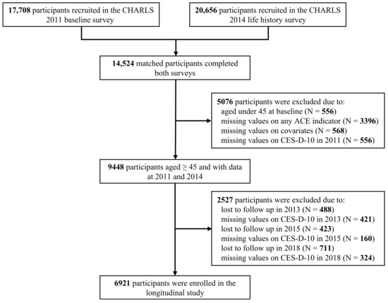 The data for this study were drawn from the China Health and Retirement Longitudinal Study (CHARLS), a nationally representative longitudinal survey of middle-aged and elderly community-dwelling adults [35,36]. In brief, the national baseline survey of CHARLS was conducted between 2011 and 2012, covering 17,708 respondents randomly selected across 150 counties or districts and 450 villages or urban communities in 28 provinces in China. To date, several follow-up surveys were performed in 2013 (N = 18,612), 2015 (N = 21,097), 2018 (N = 19,816), and 2020 (N = 19,395). In 2014, face-to-face interviews were conducted to collect life history information for all living respondents in the 2011 and 2013 waves (N = 20,656). In this study, we utilized data from the 2011, 2013, 2015, and 2018 main surveys and the 2014 life history survey. The final analytical sample included 6921 individuals aged 45–87 years after excluding those without the required information on any analytical measures (Figure 1).