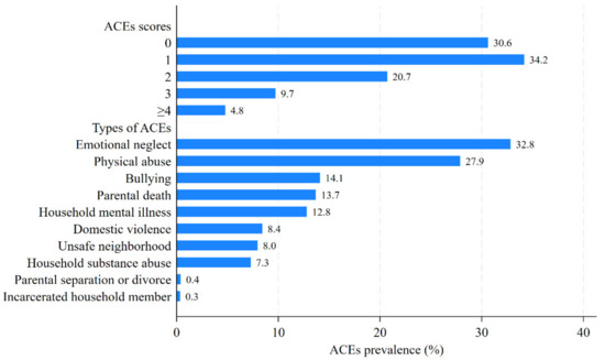 The percentage of participants with different ACE scores and ACE types.