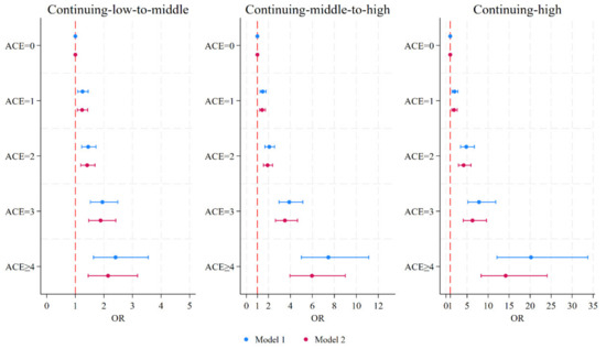 Forrest plot of the association between ACE scores and depressive symptom trajectories. Model 1 was adjusted for gender, age, education level, marital status, hukou status, residence, parental education level, participants’ education level, participants’ employment status, smoking, and drinking in 2011 baseline survey. Model 2 additionally included the mediators. ACEs, adverse childhood experiences; OR, odds ratio.