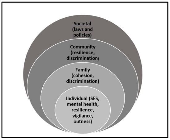 The second level of influence examines the role of the family in shaping suicidal ideation among sexual and gender minorities (SGMs). Families serve as a critical support system, but their influence can be either protective or detrimental [,,]. Experiences of family discrimination, such as rejection or lack of acceptance due to one’s sexual orientation or gender identity, have been shown to significantly increase the risk of suicidal ideation []. In contrast, family cohesion, which is characterized by emotional support, open communication, and acceptance, acts as a protective factor, decreasing the likelihood of suicidal ideation [,,,,,]. These findings highlight the central role of familial dynamics in shaping mental health outcomes for SGM individuals [,,,,].