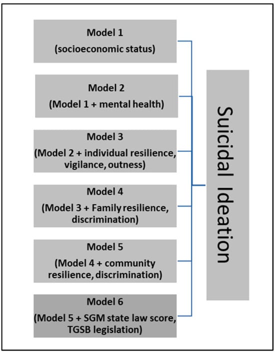 Descriptive statistics were conducted for the sample and include mean and standard deviation (SD) for continuous variables and number and percentage for categorical variables. Hierarchical multiple regression was used to enter variables into the analysis in blocks (Figure 2). A total of six models were generated. The first three models included variables at the individual level of the SEM: model 1—sociodemographic variables, model 2—model 1 variables + mental health variables, and model 3—model 2 variables + individual resilience measures, outness, and vigilance. The fourth model added the family level of the SEM: model 3 + family discrimination and cohesion. The fifth model added the community level of the SEM: model 4 + community discrimination and social resources. The final (sixth) model added the social level of the SEM: model 5 + laws and policies. Because of concerns with multicollinearity, we calculated collinearity statistics for each model, which provided the tolerance and variance inflation factor (VIF). In the final (sixth) model, no variable was considered to have severe multicollinearity (VIF > 10) which would have undermined the reliability of the regression model. Only one variable (gender expression discrimination distress) was greater than 5, at 5.5, which would suggest moderate multicollinearity. Because this variable was only slightly above 5, we kept it in the final model. Additionally, 88 participants were missing the outcome variable; they were excluded from the hierarchical multiple regression analysis. Analyses were performed using SPSS. The significance level was set to 0.05, and all p values were two-sided.