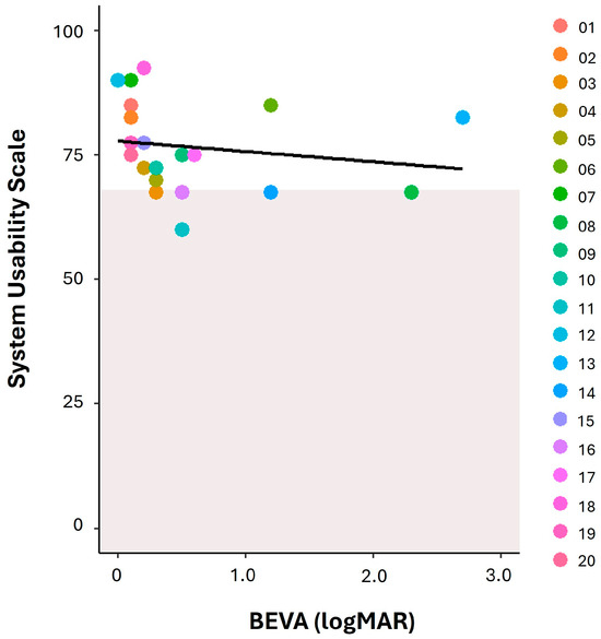 | Participant ID | Age Bracket (Years) | Principal Diagnosis | BCVA RE (logMAR) | BCVA LE (logMAR) | SUS |