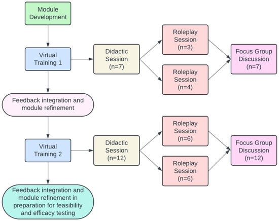 Module content was originally developed by a team of multidisciplinary clinicians (WER, KDA, KA, PAP) and refined through iterative meetings with Memorial Sloan Kettering Cancer Center (MSK) Communication Skills Training Program and Research Laboratory (Comskil) faculty and research trainees (SCB, MM, AK). The modules were delivered virtually through MSK Comskil using well-documented approaches to module facilitation [29,30]. Following initial development of the module, two virtual training sessions were conducted, each of which was composed of a didactic and roleplay session and followed by a focus group discussion. Feedback was integrated and the module refined following each training, as shown in the study schema (Figure 1). The study was deemed exempt by the MSK Institutional Review Board.