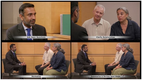 The module consisted of a 30 min didactic presentation that summarized relevant empirical literature and presented a communication blueprint comprising recommended communication strategies, skills, and process tasks. The blueprint provides all communication components of the module and guides development of all relevant teaching materials and evaluations. Our Comskil conceptual model defines communication strategies as a priori plans that direct communication behavior to realize a communication goal (i.e., desired outcome of a clinical encounter or consultation); communication skills are discrete modes (i.e., unit of speech) a clinician uses to further dialogue and achieve a strategy; and process tasks are sets of dialogues or nonverbal behaviors that create an environment for effective communication [29]. In addition, exemplar videos were incorporated throughout the didactic portion of the training to demonstrate the strategies, skills, and process tasks taught during the didactic. Figure 2 shows a series of clips from the exemplar video of a communication encounter between a clinician, patient, and the patient’s chosen family member. As skills are demonstrated by the clinician in the video, text overlays are provided to allow learners to easily identify them (e.g., asking open-ended questions, clarifying relationships).